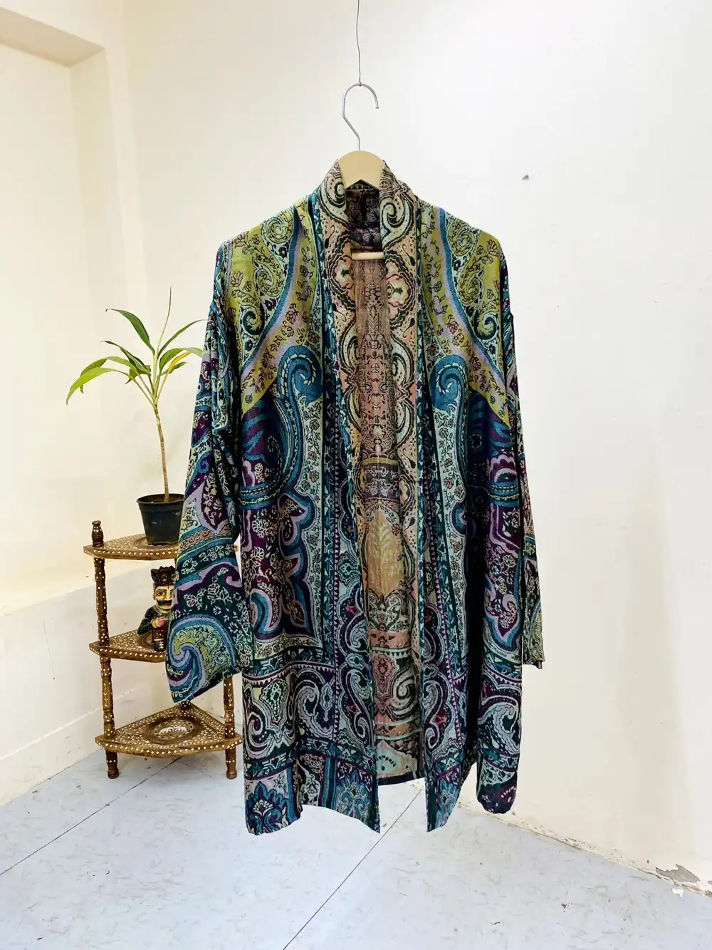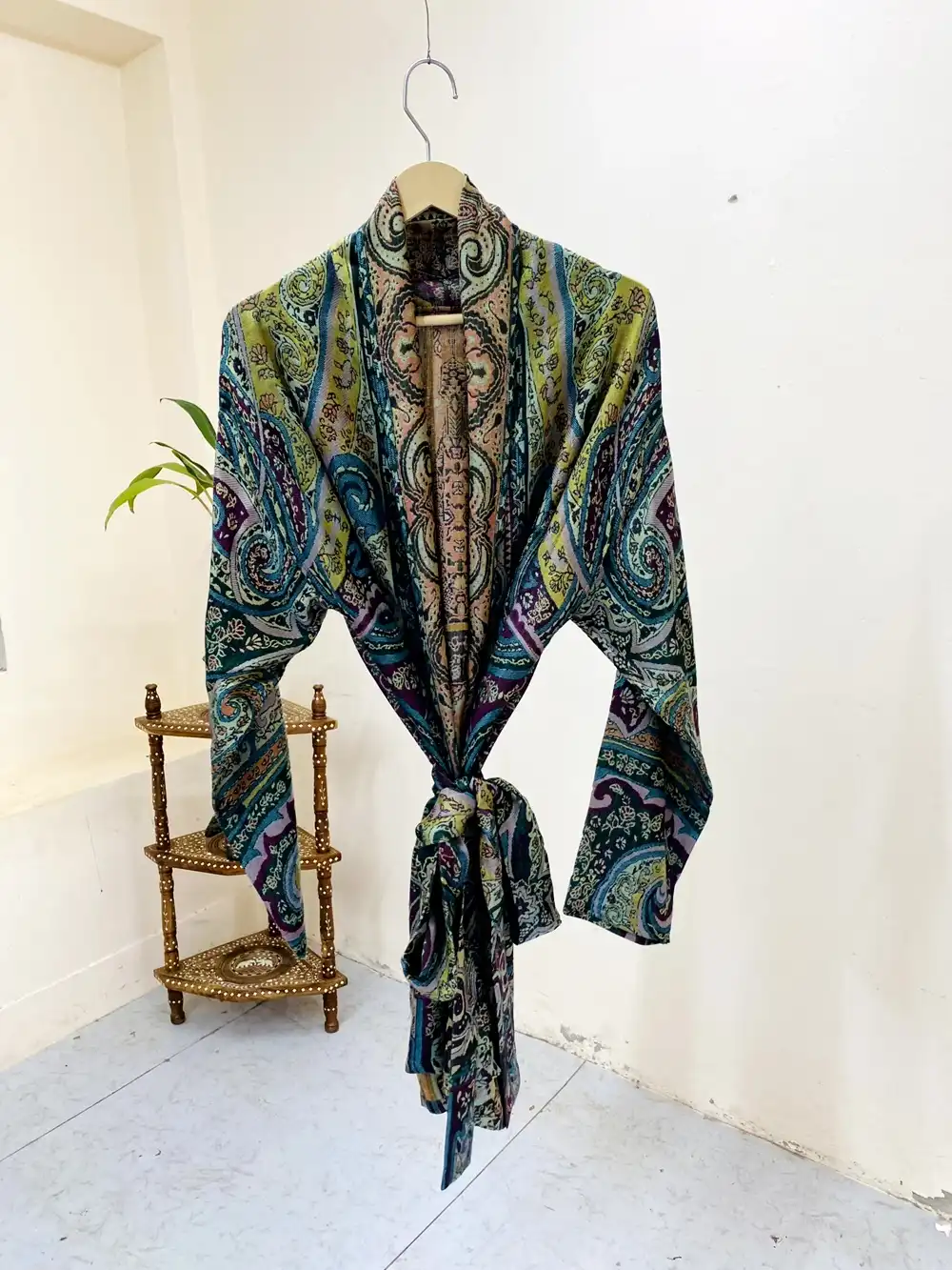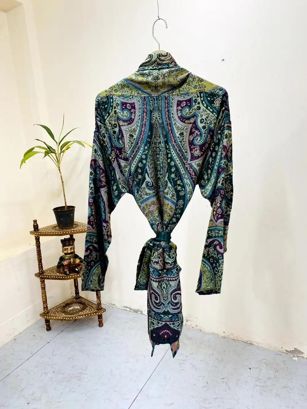 ” Reversible Dressing kaftan-shirt ” Silk Kimono Robe, Kimono Jacket, Kimono Cardigan, Boho Kimono, Kaftan, Dressing Gown, Robe for Women, House Coat, Nightdress, Beach Cover Up, Women’s Clothing, Bohemian Clothing, Kimono, Gift for Her The bamboo and silk Kimono kaftan-shirt is our most versatile coat, it can be worn with jeans, dresses and skirts. A paisley traditional design in bamboo silk Kaftan Shirt. A regular length with a simple, flattering cut which suits plus size. This dress is easy to wear, with no buttons and you just wear it ready to go. The perfect compliment to a wedding outfit, party wear dress, Women match with Skirt or a Denim jeans or Palazzo etc. *Note :- Color will be same, design may differ due to running fabric. Thank You!
