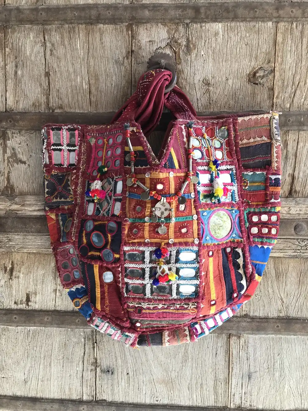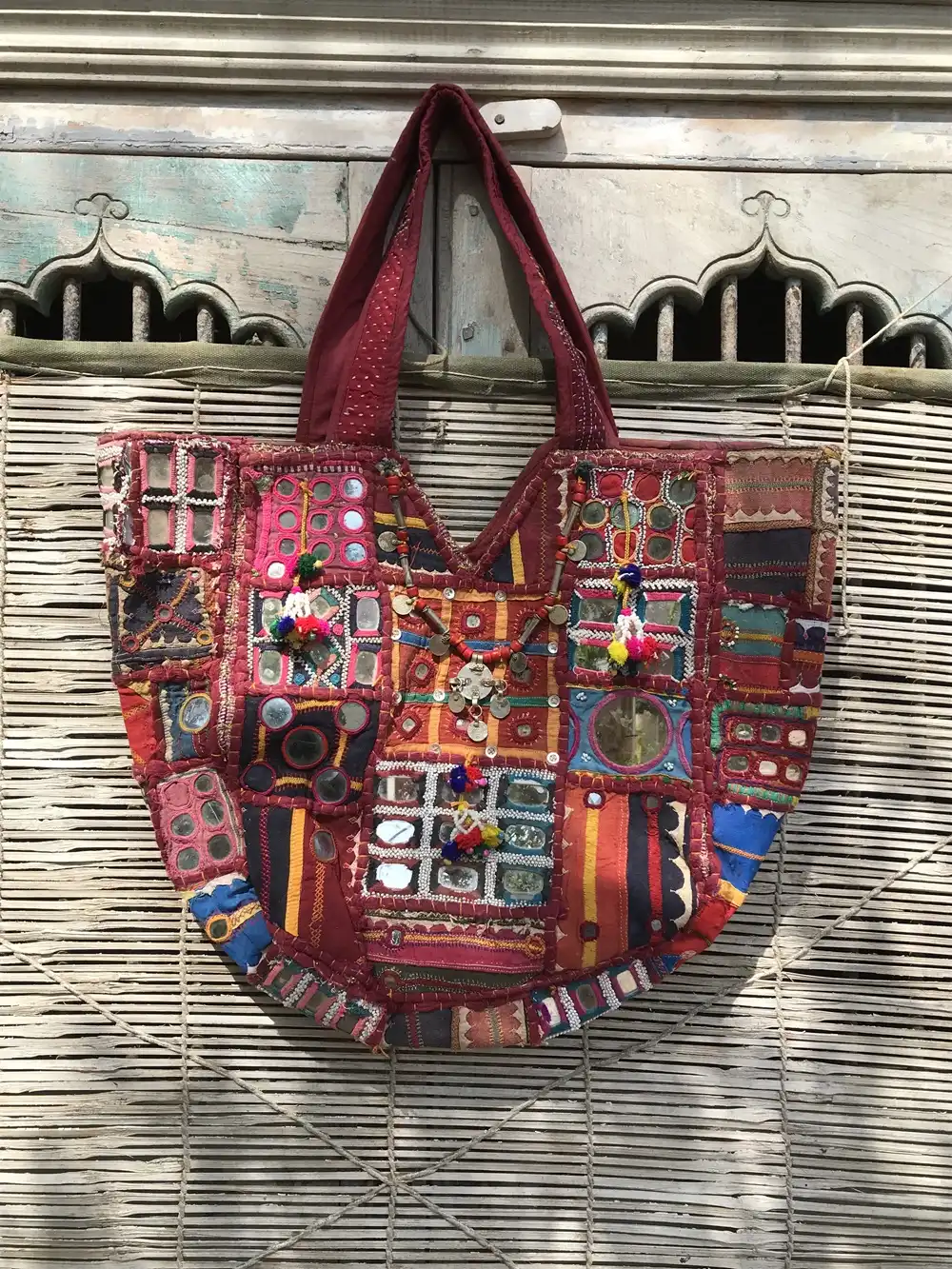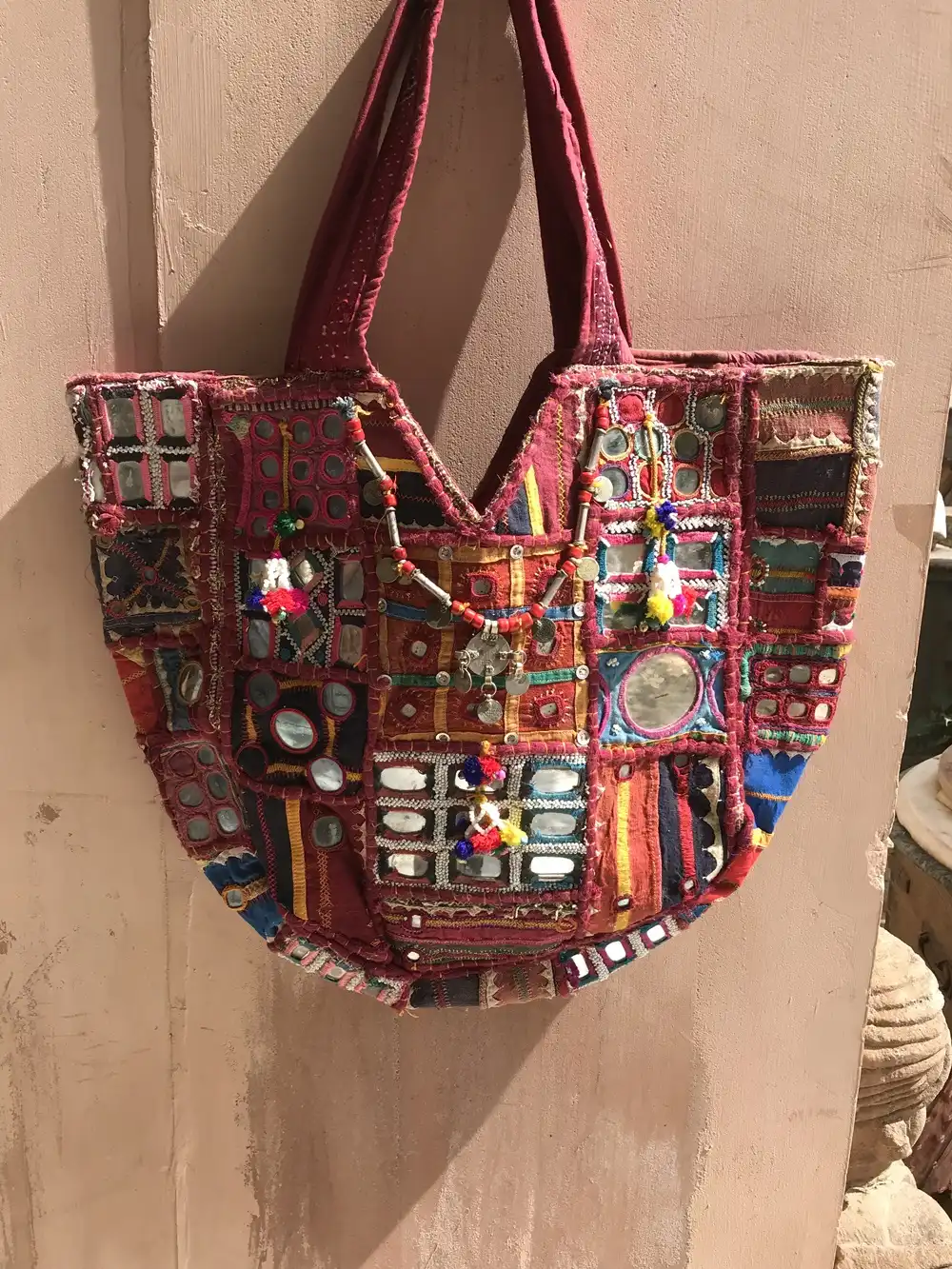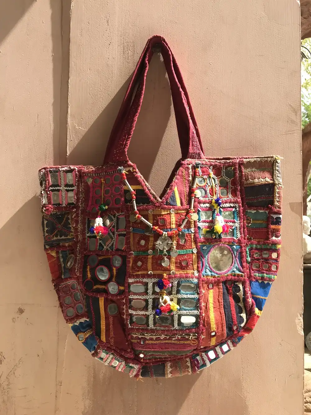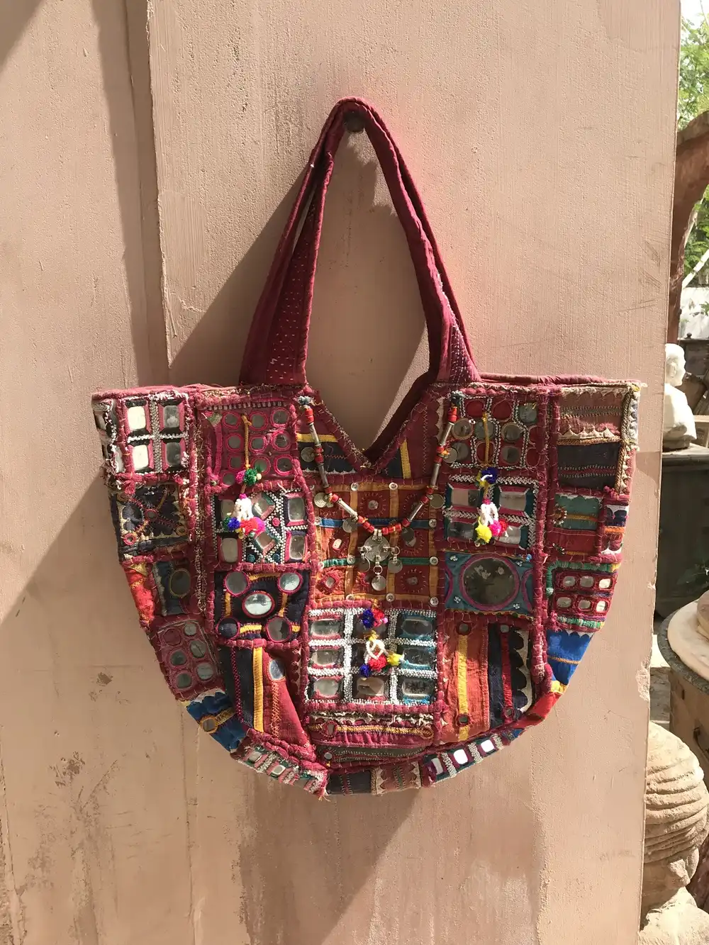 One of a kind beautiful Indian boho Banjara bag. This bag is made of antique vintage textiles part of traditional dresses, ,hand made by women in India, Afghanistan, Pakistan long time ago and were made now into a large tote. Beautiful Indian boho Banjara Large Size shoulder bag with a Classic hanging bead tassel to accentuate the beauty and vintage Indian embroidered textiles were carefully brought together and made into large totes. There is a zip chain for closure to keep your belongings safe. They look equally good on the beach with a bikini, or in the city with an edgy leather jacket. The Overall Patchwork has a Handknit Contemporary design, the variety of artwork using cotton thread on the bag is a stunning addition to your wardrobe. Bohemian Tribal and Unbeatable Indian Ethnic patchwork Bags & handbags are a hit with stylists all over the world. This perfectly sized shoulder bag is an ensemble from a selection of assorted bright vintage fabrics from India. Each bag is intricately embroidered and beautifully decorated. The cotton flat strong shoulder strap makes it more stylish and comfortable to carry. The Overall design gives you the option of carrying both ways.