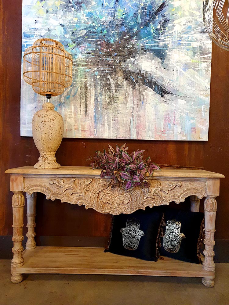 A Designer White Pickled Mango Wood Console is a stylish and versatile furniture piece that combines elegant design with the natural beauty of mango wood. Material: Crafted from mango wood, a durable and sustainable hardwood, the console is known for its strength and unique grain patterns. The pickling process involves applying a white stain that seeps into the wood, creating a light, washed-out effect while allowing the natural texture and grain of the wood to show through. Design: The console features a sleek and modern design, often with clean lines and minimalistic detailing. The white pickled finish gives the wood a weathered, rustic look while maintaining a contemporary aesthetic. The console may have a smooth surface or subtle distressing, enhancing its vintage charm. Color: The console has a white pickled finish, which imparts a subtle, whitewashed appearance to the wood. This soft, muted color allows the natural variations in the mango wood grain to shine through, creating a visually appealing contrast. Storage: The console typically includes storage options such as drawers, shelves, or cabinets. These storage compartments provide functional space for organizing items like keys, mail, or decorative accents. Some consoles may feature open shelving for displaying decorative items or books. Hardware: The console may have minimalist or decorative hardware, such as metal or wooden knobs or handles. These hardware elements add a touch of sophistication and functionality to the piece. Versatility: A white pickled mango wood console is highly versatile and can be used in various spaces, including entryways, living rooms, dining rooms, or hallways. Its slim profile makes it ideal for smaller spaces, while its storage capabilities enhance its practicality. Maintenance: Regular dusting with a soft, dry cloth is usually sufficient to maintain the console’s appearance. For more thorough cleaning, a slightly damp cloth can be used. It’s essential to avoid harsh chemicals or abrasive materials that could damage the finish. Aesthetic Appeal: The white pickled mango wood console exudes a sense of understated elegance and rustic charm. Its neutral color palette makes it easy to pair with different decor styles and color schemes, allowing it to seamlessly blend into various interior design concepts.   Thank You !