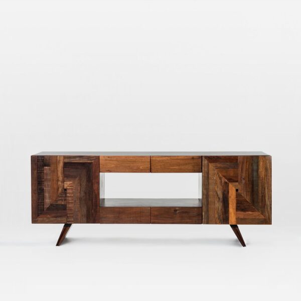The “Reclaimed Peroba Wood Wedge Leg Console Media Unit (83″)” is a distinctive and environmentally conscious piece of furniture designed to accommodate your home entertainment needs while making a sustainable and stylish statement. Here’s a description of this unique media console: