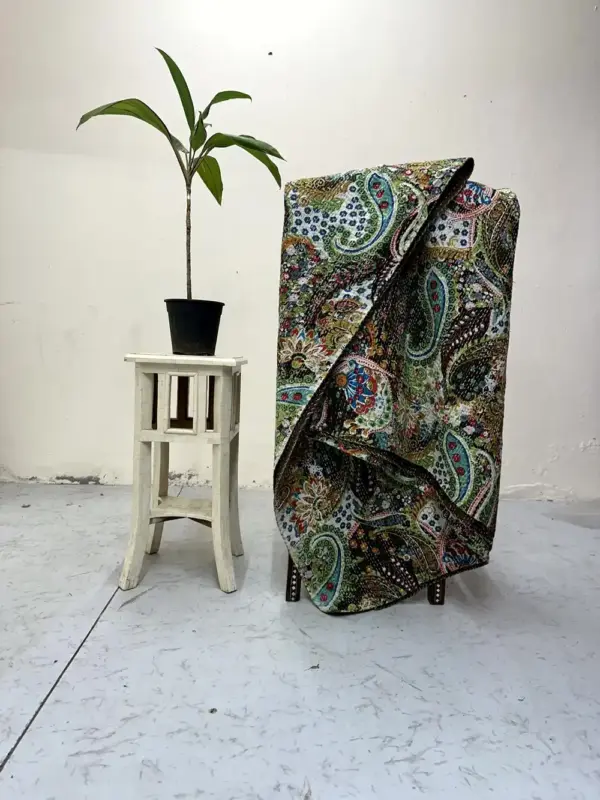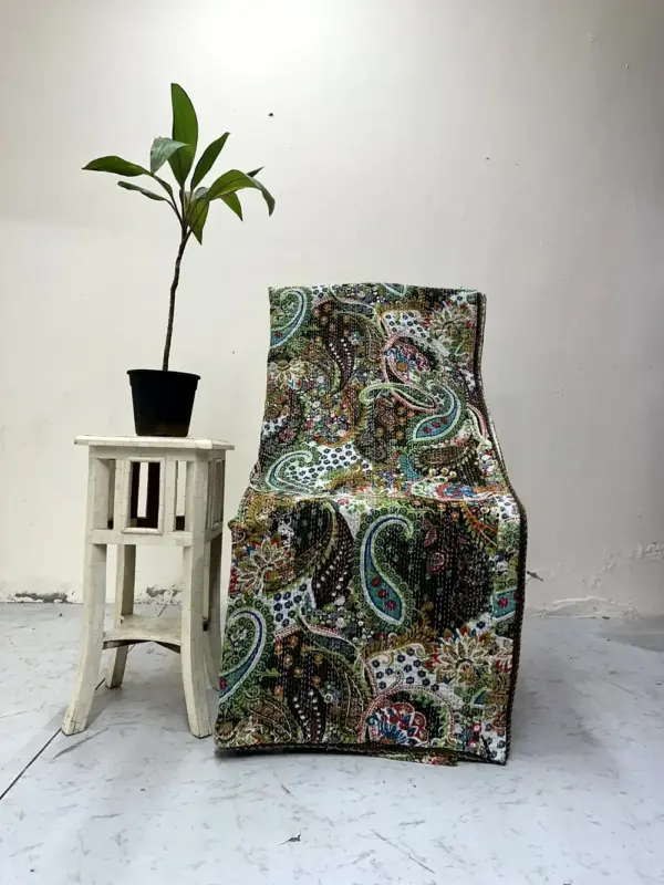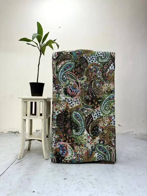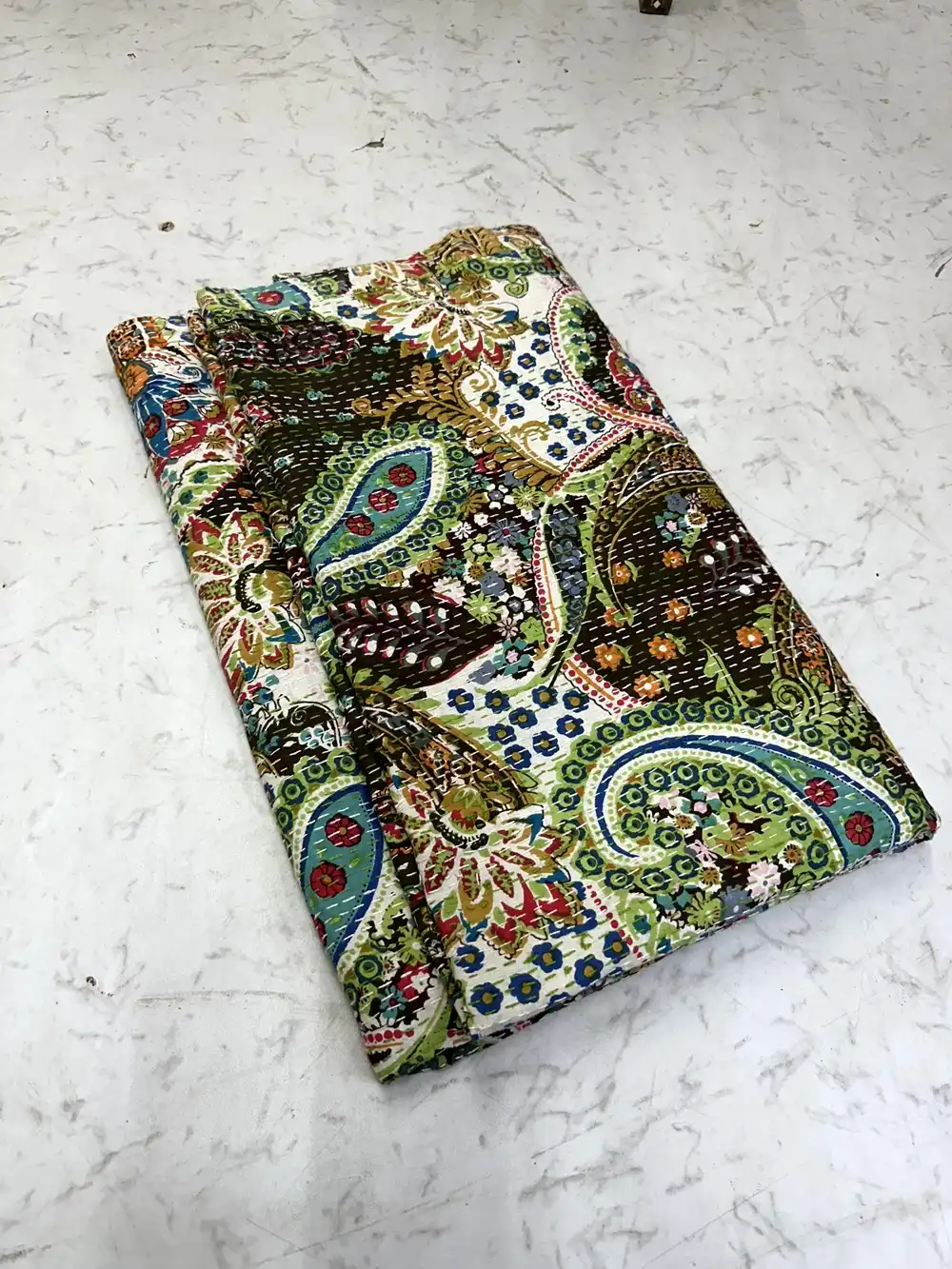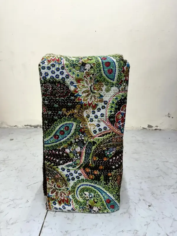 It can be use as a bed cover,bedspread,quilt,wall decor,picnic&beach throw etc. Kantha is still the most popular form of embroidery practiced by rural women. typically use saris and cloth and layer them with kantha stitch to make a light blanket, throw or bedspread. The Reverse side is completely usable clean plain colour kantha stitch throw. You can judge the quality of Kantha by the Stitch Size (Distance between the stitches) and by the Weight of the product. These cotton lightweight “Quilts” with a beautiful and colorful Floral design can be used as: 1. Bedspread , Bedding Throw , Blanket Or Quilt 2. A Summer Bed Cover 3. A Fabulous Picnic Rug 4. Nice Bedroom Quilt Care Instruction’s :- Dry Clean & Hand Wash Only ! Thanks !